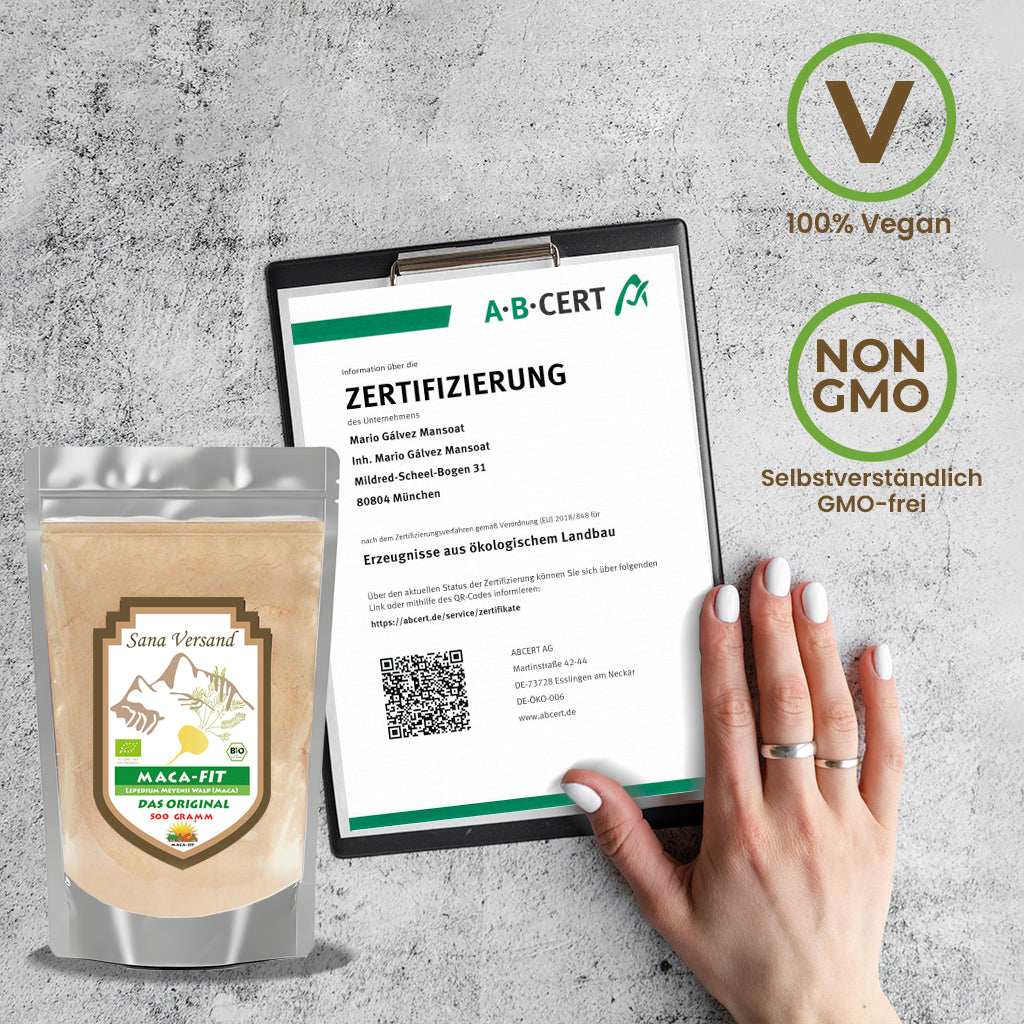 Ob schwarzes Maca, rotes Maca oder gelbes Maca Pulver: Bei Sana-Versand erhalten Sie zertifizierte Qualität – direkt aus Peru und regelmäßig unabhängig geprüft. Ideal für alle, die Bio Maca kaufen möchten und Wert auf nachvollziehbare Herkunft legen.