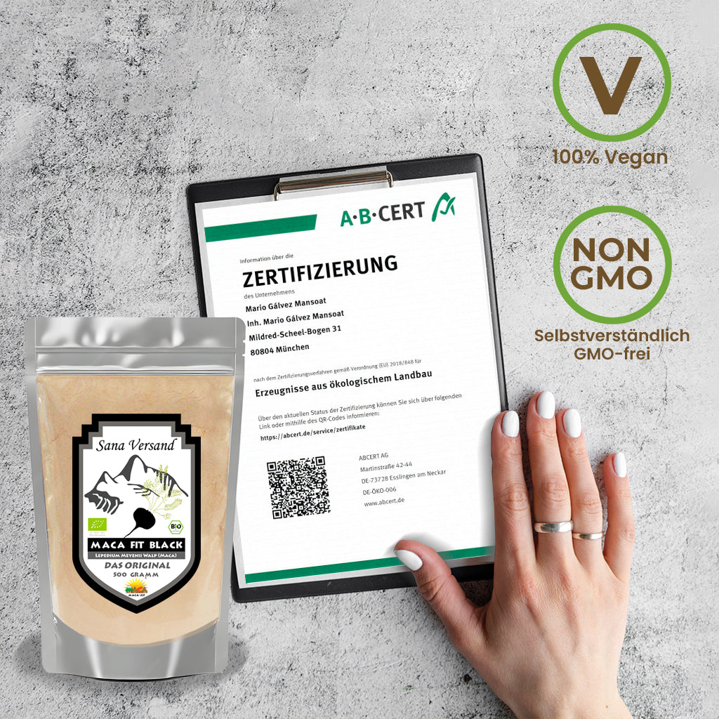 Ob schwarzes Maca, rotes Maca oder gelbes Maca Pulver: Bei Sana-Versand erhalten Sie zertifizierte Qualität – direkt aus Peru und regelmäßig unabhängig geprüft. Ideal für alle, die Bio Maca kaufen möchten und Wert auf nachvollziehbare Herkunft legen.