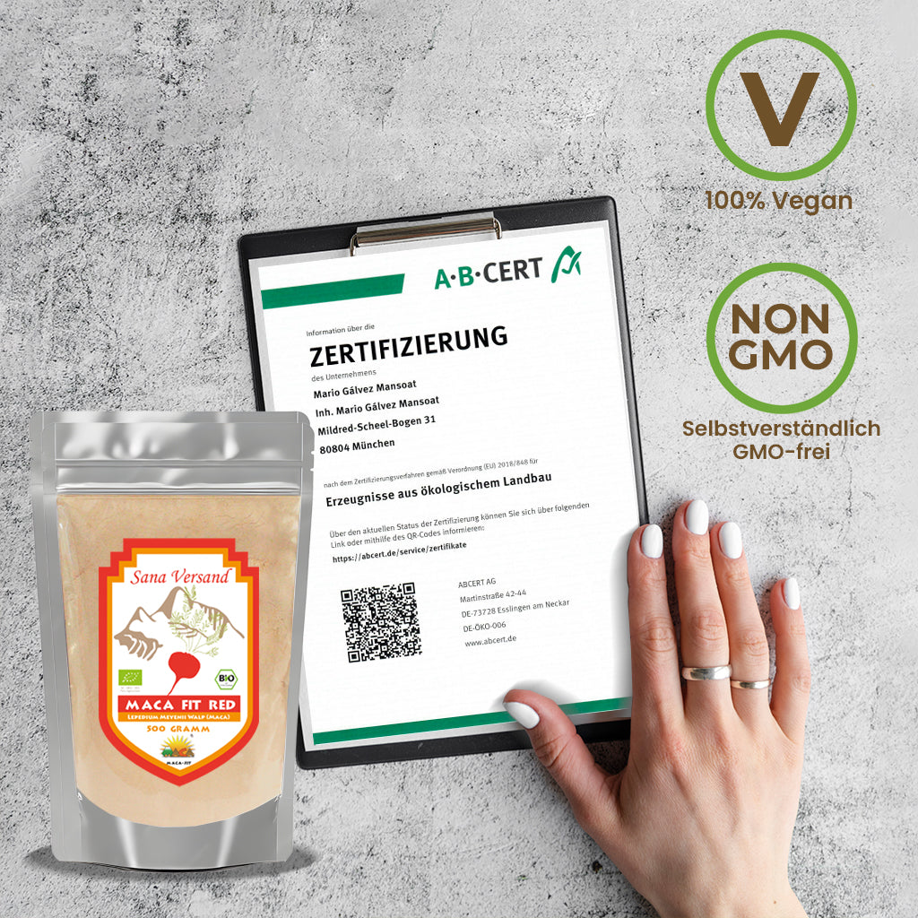Ob schwarzes Maca, rotes Maca oder gelbes Maca Pulver: Bei Sana-Versand erhalten Sie zertifizierte Qualität – direkt aus Peru und regelmäßig unabhängig geprüft. Ideal für alle, die Bio Maca kaufen möchten und Wert auf nachvollziehbare Herkunft legen.